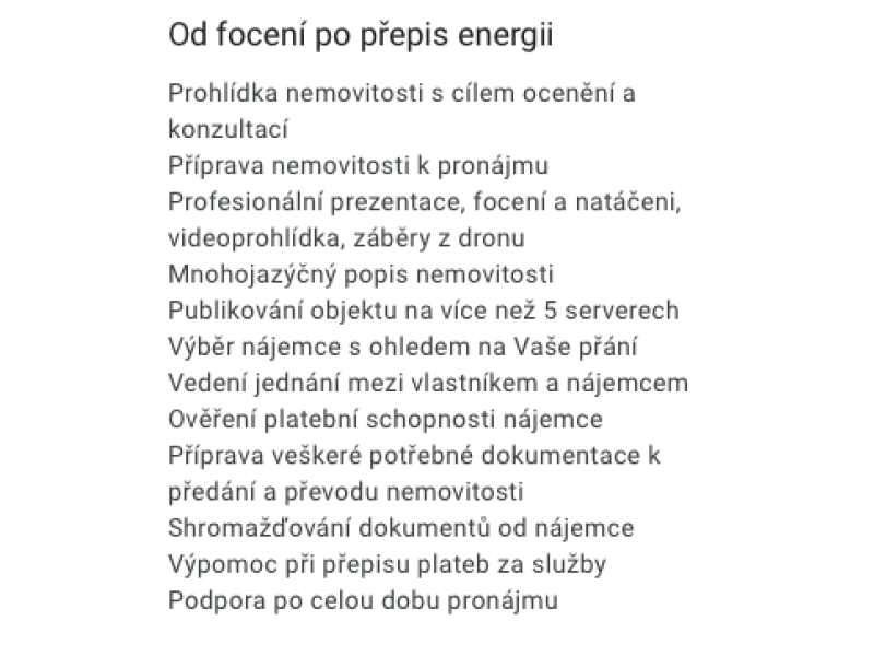 Od focení po přepis energii. Prohlídka nemovitosti s cílem ocenění a konzultací. Příprava nemovitosti k pronájmu. Profesionální prezentace, focení a natáčeni, videoproohlídka, záběry z dronu. Mnohojazyčný popis nemovitosti.