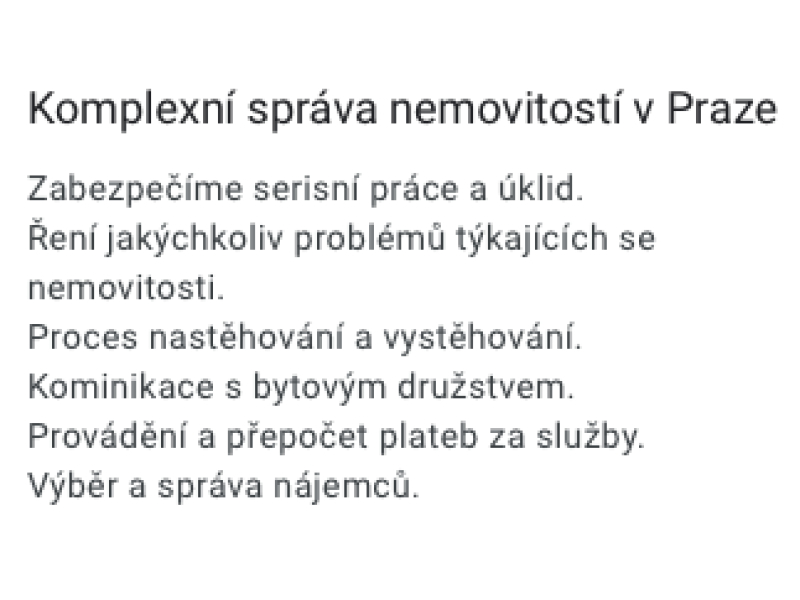 Komplexní správa nemovitostí v Praze. Zabezpečíme servisní práce a úklid. Řešní jakýchkoliv problémů týkajících se nemovitosti. Proces nastěhování a vystěhování. Komunikace s bytovým družstvem. Provádění a přepočet plateb za služby.