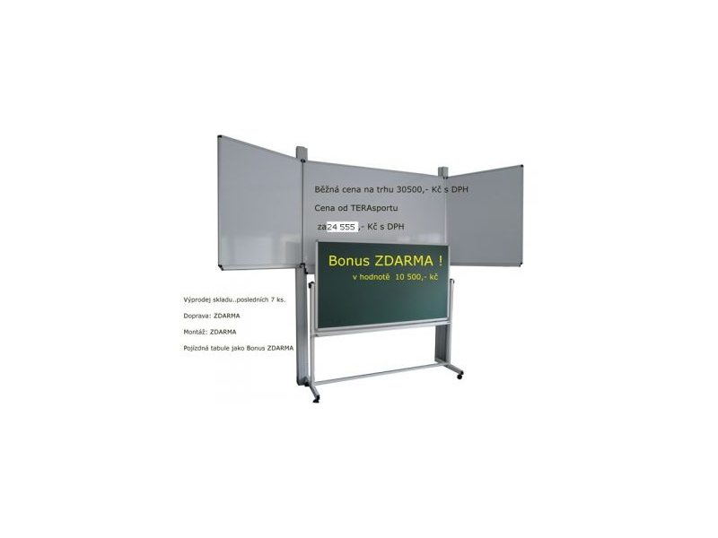 Rozměr: 400x120 cm otevřená, 200x120 cm zavřená, popis: kombinovaný křída/fix,povrch:keramická, magnetická, odkládací lišta, barevné provedení: zelená, bílá, zeleno/bílá, kompletní tabule: včetně pylonů, standardní výška pylonu: 290 cm - za příplatek až 330 cm