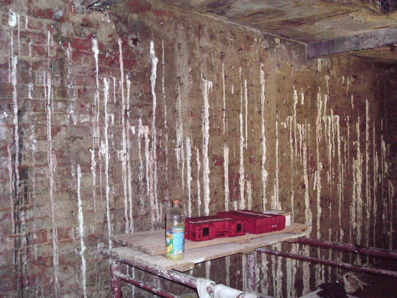 Dodatečná izolace zdiva proti vzlínající i tlakové zemní vlhkosti vstřikováním polyuretanové hmoty zdiva.