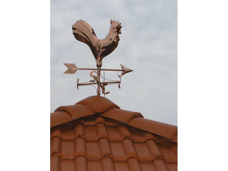 Celková výška, měřeno od hřebene střechy je 70 cm. Kohout se dle větru otáčí na pevném podstavci, který si usadíte dle světových stran.