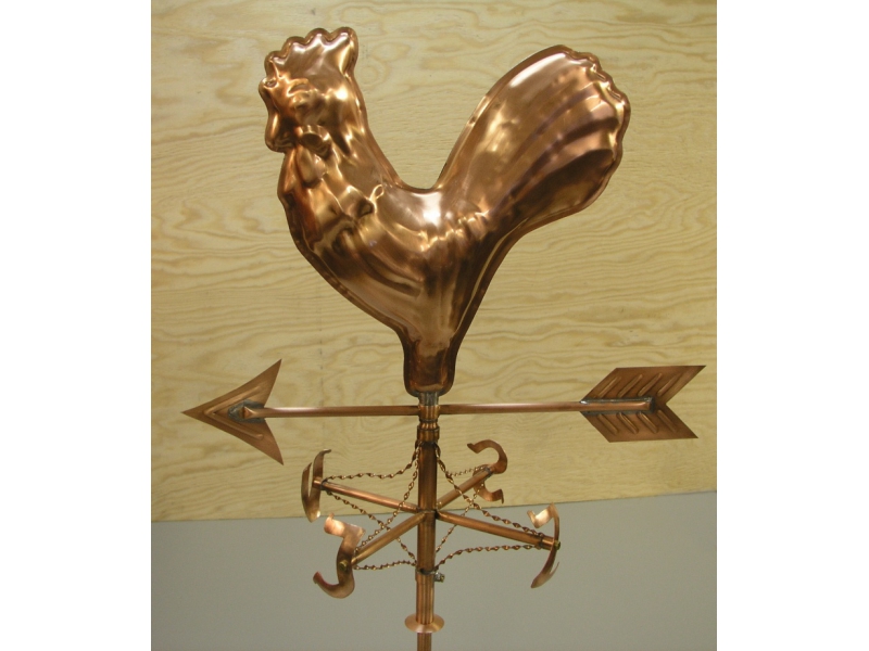 Celková výška, měřeno od hřebene střechy je 70 cm. Kohout se dle větru otáčí na pevném podstavci, který si usadíte dle světových stran.