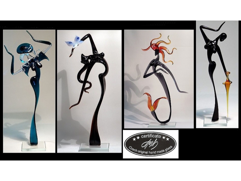 Skleněné figury vyráběné ze sklářských tyčí na sklářském kahanu, které vyrábí naše firma, jsou založeny na vlastním vývoji a autorském chráněném designu. Jedná se o ojedinělou originální produkci ručně tažených figur velikosti cca 33 - 45 cm.