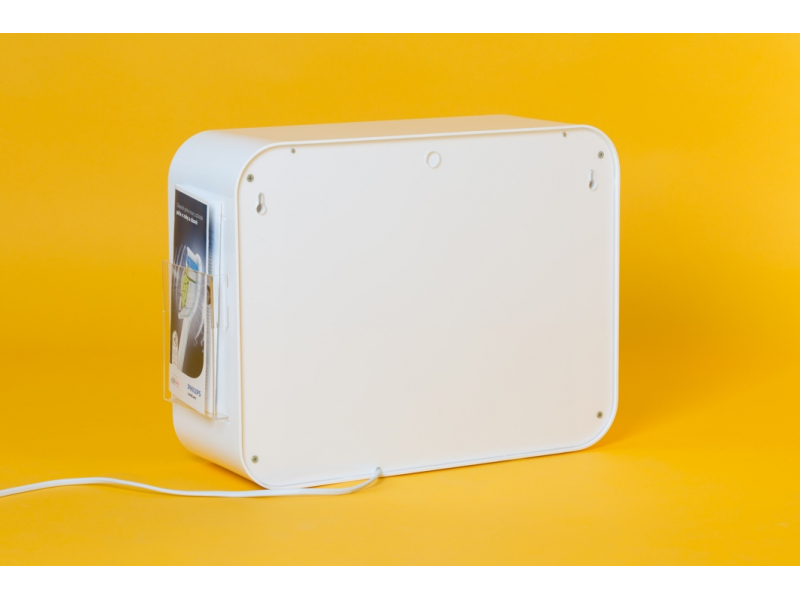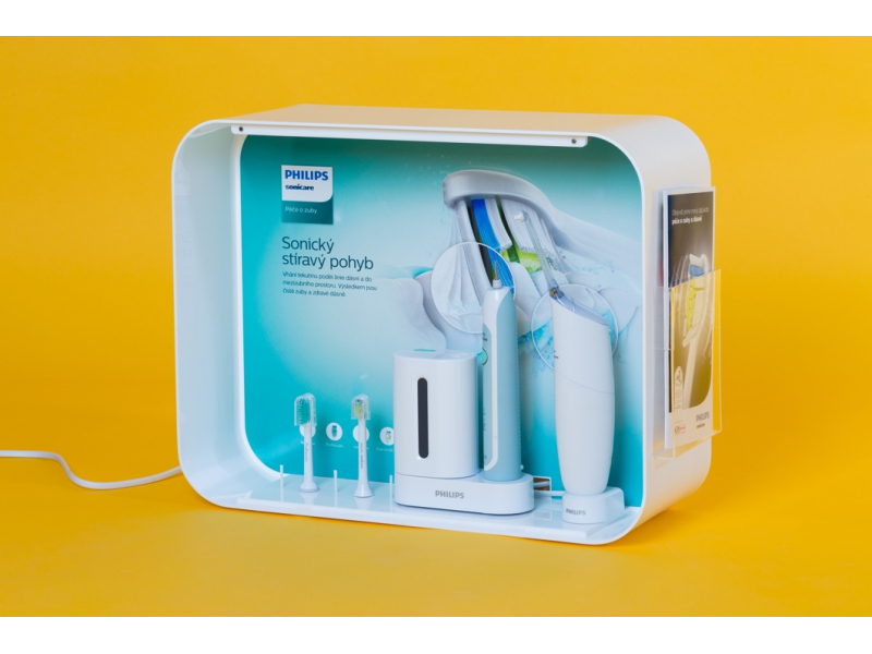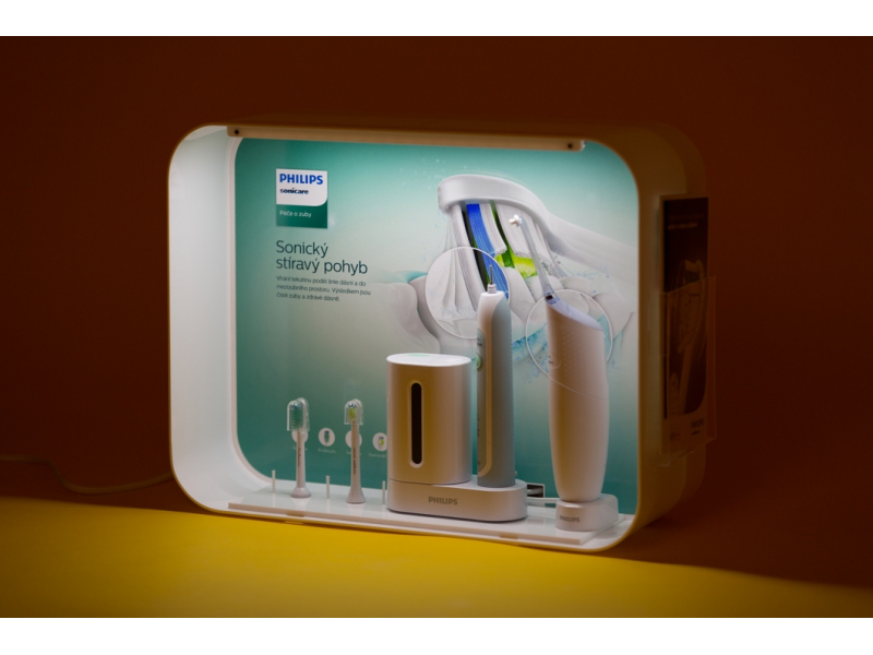 Stojan je zhotoven z plexiskla, prezentované produkty jsou nasvíceny LED páskem. Je určen pro prezentaci na pultu i pro zavěšení na stěnu.