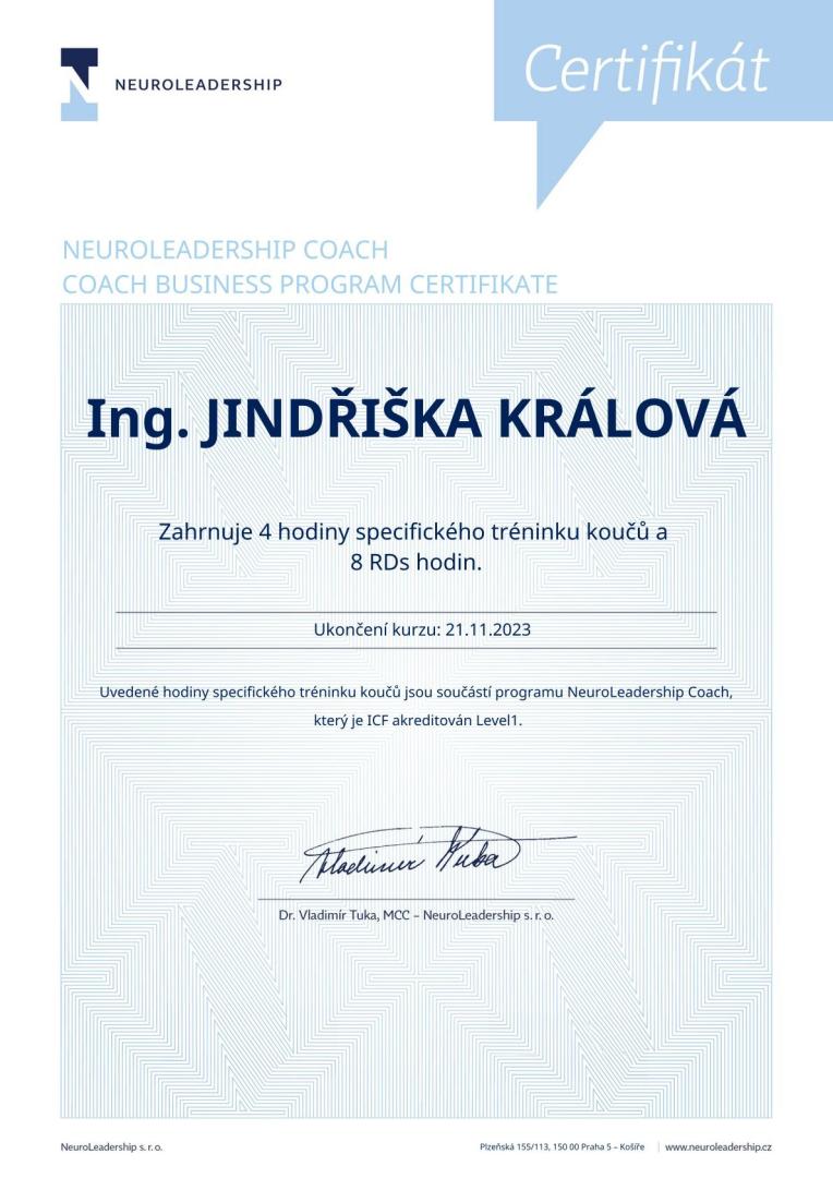 Absolvovala jsem Braind-Based koučovací výcvik založený na neurovědách na renomované škole NeuroLeadership pod vedením Dr. Vladimíra Tuky, MCC.