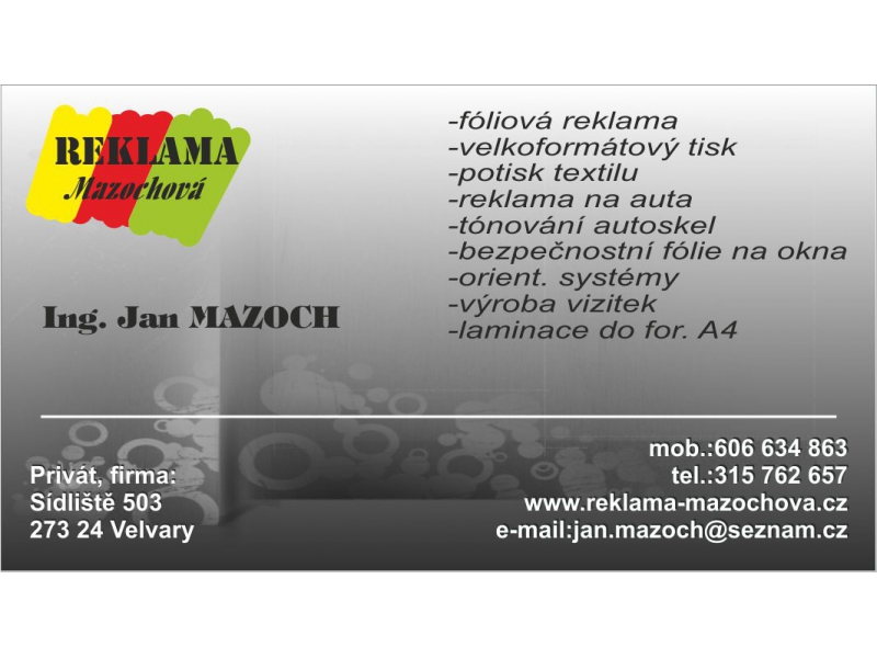 Nabízíme reklamu pro interiér i exteriér. Zabýváme se velkoformátovým tiskem,řezanou reklamou.Tiskneme samolepky,vizitky,plakáty,bannery.Vše i v malonákladě. Nabízíme také tónování autoskel s licencí,aplikaci bezpečnostních fólií třídy P2A a P4A.Dále u nás najdete také potisk textilu.Jsme firma, která je na trhu již 13 let. Těšíme se na spolupráci.