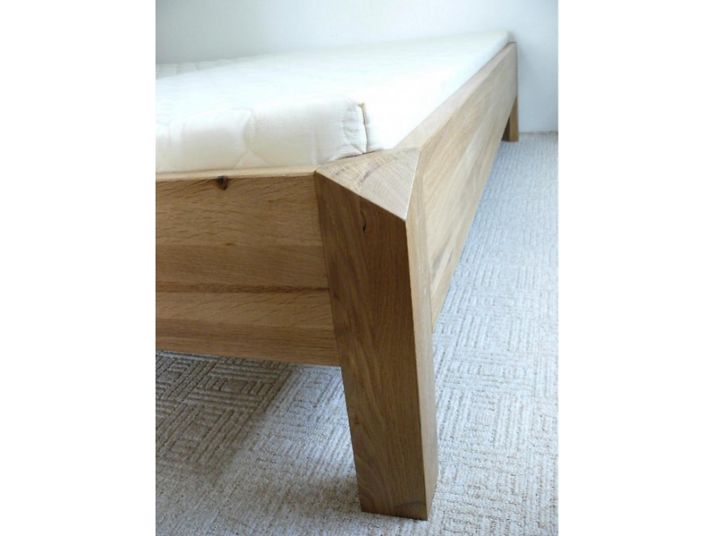 Postel z masivní dubové 3cm silné spárovky bez čela. Nohy jsou z dobového masivu průřezu 75 x 75mm se sraženými hranami. Rozměry jsou 168 x 225 x 40cm.