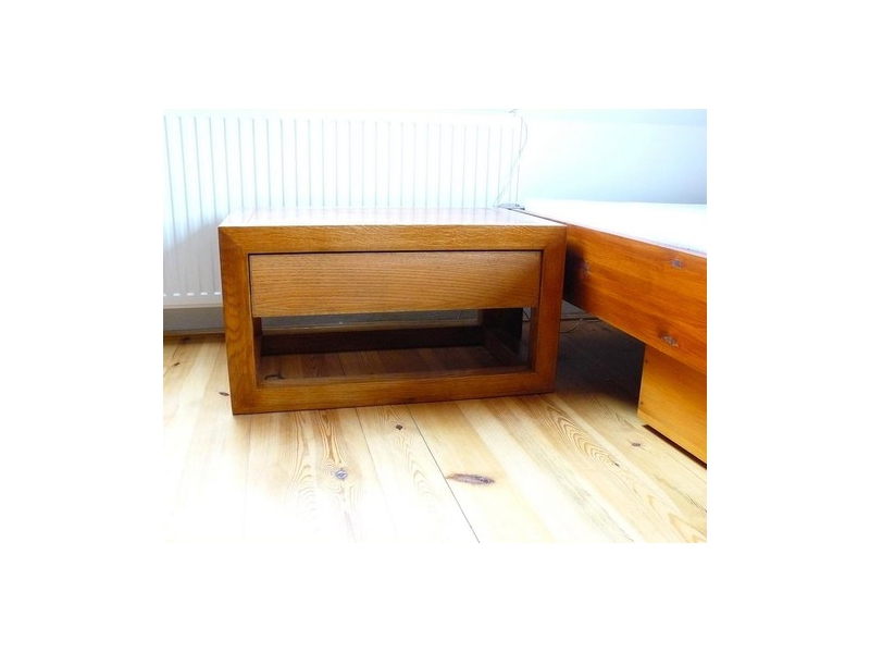 Konstrukce komody je z masivních dubových hranolků (6 x 6cm). Rozměry: délka 80cm, výška 43cm a hloubka 50cm. Zásuvka je vysoká 14cm, usazená na plnovýsuv s kuličkovými ložisky.