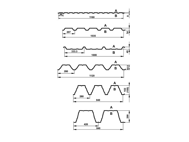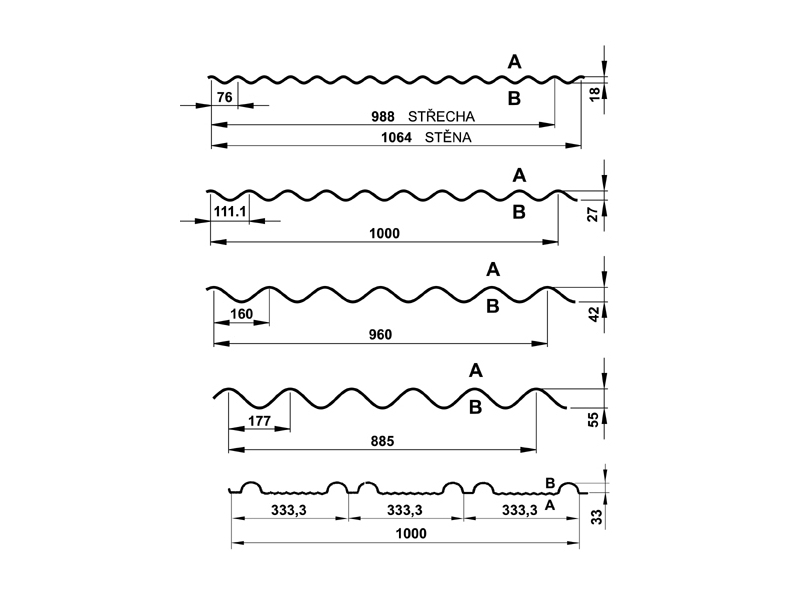 Tenkostěnné ocelové trapézové plechy standardně pozinkované s povrch. úpravou polyester pro exteriér 25mic, inter.12-15mic., na požádání jinou. Použití na fasády, podhledy, ztracené bednění, střešní krytiny, nosné střechy. Možnost zakružení či perforace