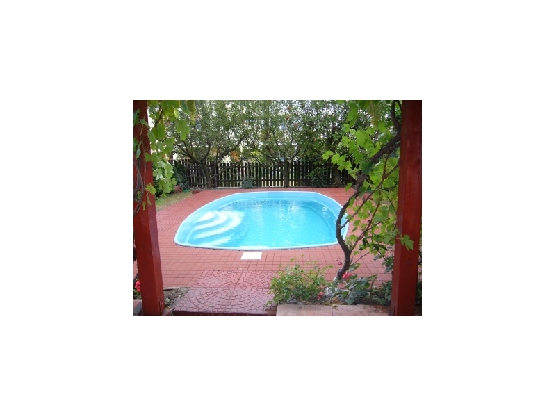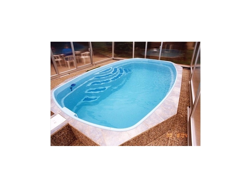 Sklolaminátový bazén (5 x 3 x 1,25) s polykarbonátovým zastřešením a technologií (písk. filtrace, 6ticestný ventil, čerpadlo, skimmer, vratné trisky).