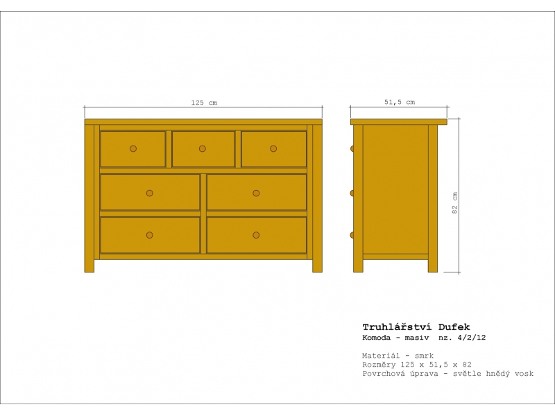 Masivní smrková komoda. Povrchová úprava barevným voskem. Rozměry 125 x 51,5 x 82cm. MOžnost volby úchytek a barevnosti komody dle přání zákazníka.