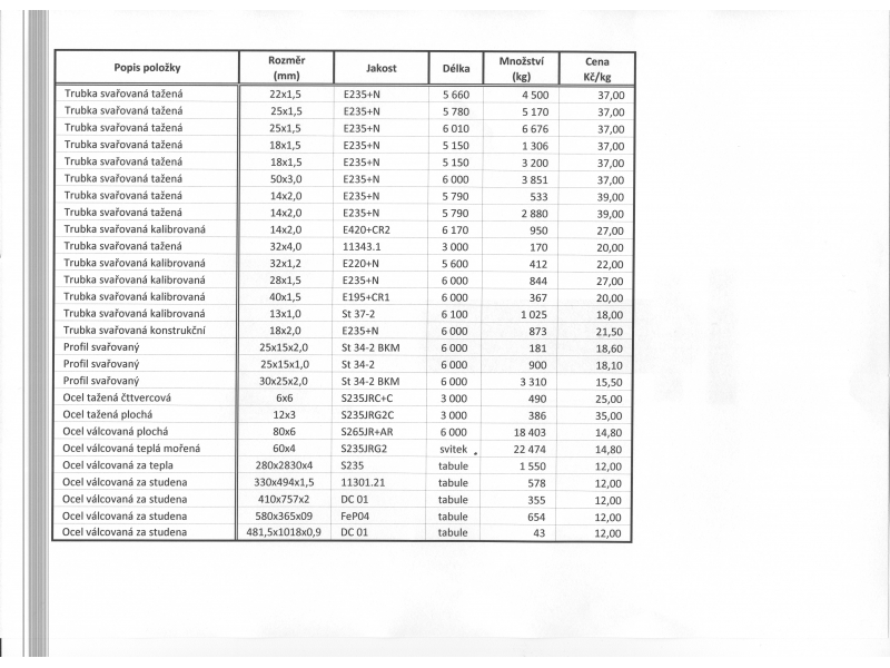 Zabýváme se velkoprodejem hutního materiálu se zaměřením na ocelové svařované přesné trubky kalibrované a tažené, uzavřené profily různých průřezů v provedení svařovaném a taženém (z pásky válcované za studena popř. teplé mořené pásky dle DIN 2394 a DIN 2395) a taženou ocel. Dle potřeby zákazníka a na konkrétní zakázku jsme schopni dodat také ocel válcovanou za studena a za tepla, ve svitcích nebo v tabulích.