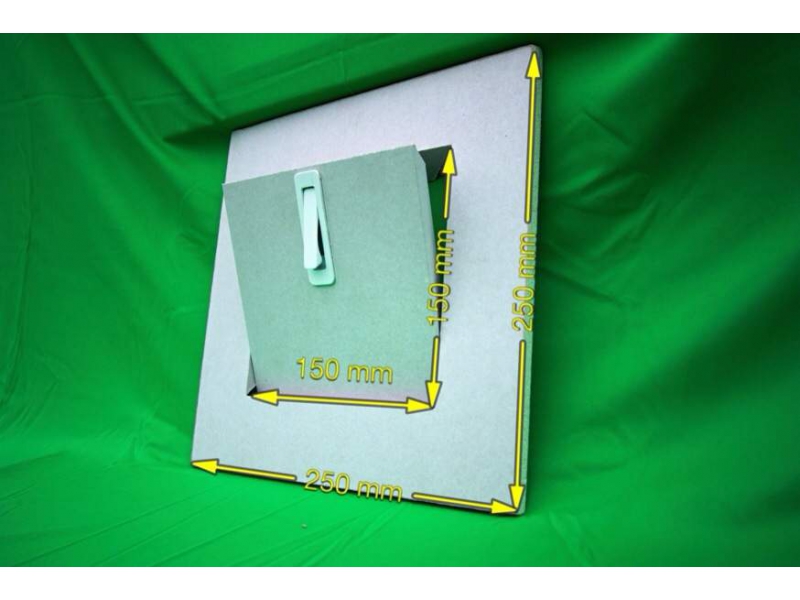 Důmyslné řešení revizních dvířek, která díky patentovanému technickému řešení jsou vyráběna z jednoho kusu sádrokartonové desky bez požití kovového rámu a bez přerušení povrchového papíru s minimální mezerou.