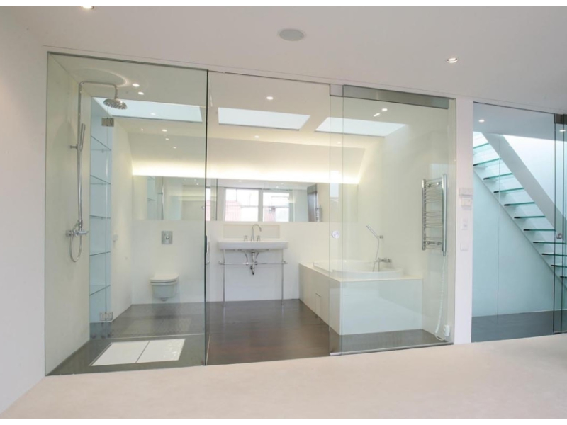 Systémové mobilní příčky prosklené i plné, bezrámové skleněné příčky, luxferové stěny, posuvné a křídlové skleněné dveře, nerezová madla, eloxované U profily. Skleněná zábradlí, sprchové kouty.